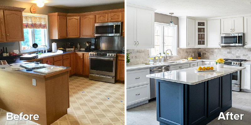 Adding blue was mandatory for this hybrid kitchen as it’s the homeowner’s favorite color. A custom kitchen island was created to replace the peninsula while existing cabinetry was refaced in Satin White Shaker style doors. Colonial Blue infuses the island with a classic, statement-worthy look.