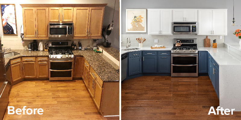 This historic Philadelphia brownstone got a fresh lift when the homeowners sought a new take on a bicentennial look. Colonial Blue was selected for the lower cabinets, while Satin White was used for refacing the upper cabinetry. Weybourne countertops and a glass backsplash further the effect to visually expand the space.